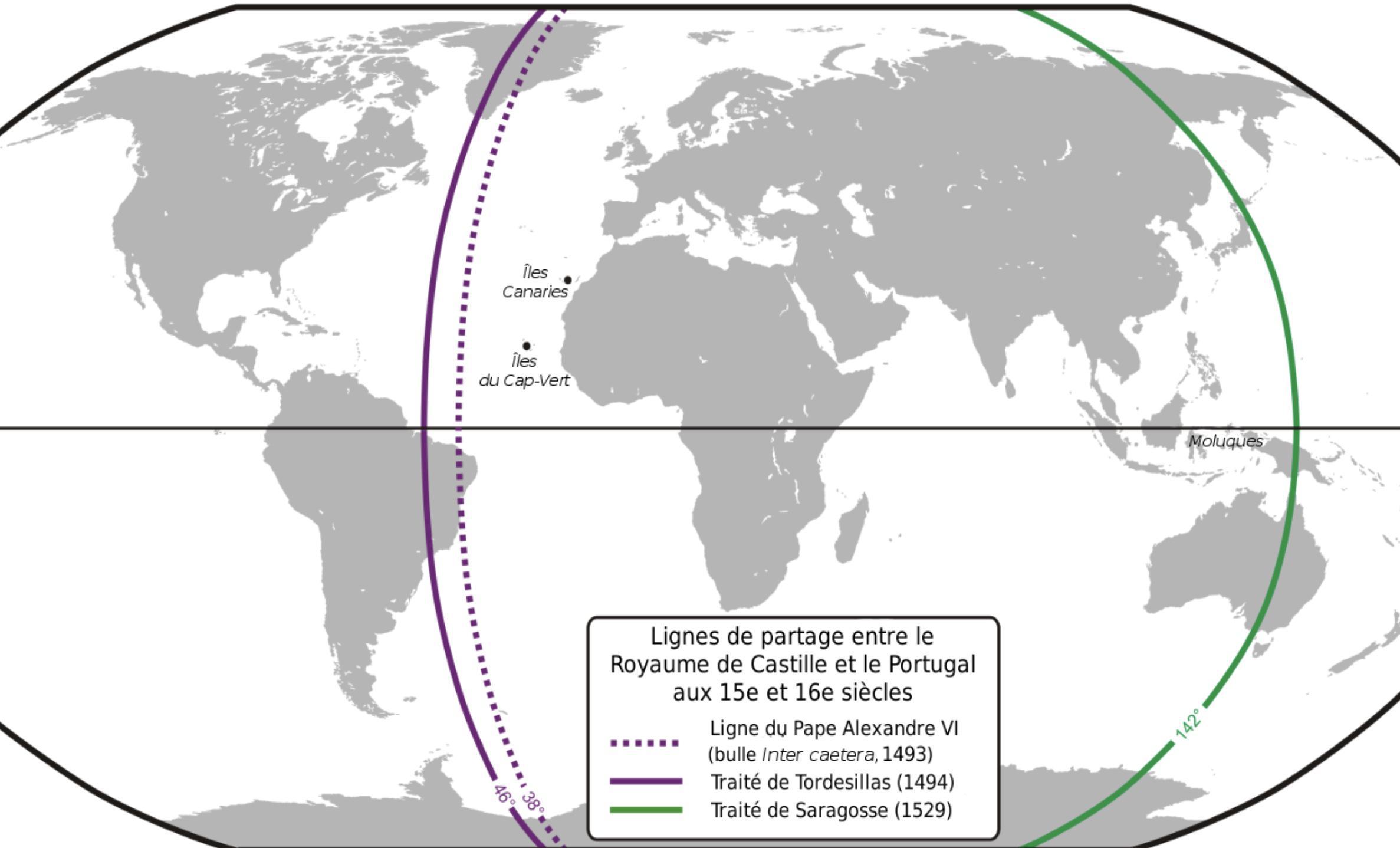 Le 7 juin 1494, les deux nations signent le Traité de Tordesillas, qui déplace cette ligne à environ 370 lieues à l’ouest des îles du Cap-Vert. Ce découpage, bien qu’arbitraire et imprécis (faute d’outils de cartographie précis), accorde au Portugal les terres d’Afrique, d’Asie, et, sans le savoir, une partie du futur Brésil, découvert par Pedro Álvares Cabral en 1500. L’Espagne obtient, pour sa part, la majeure partie du Nouveau Monde.