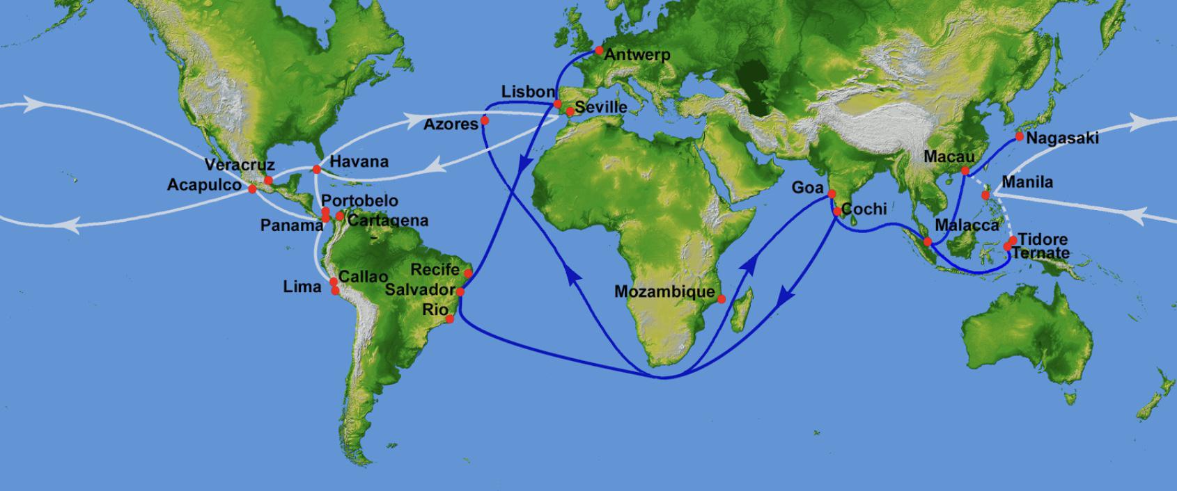 En blanc, les routes des gallions Espagnols. À cette époque, les "gallions de Manille" sont les seuls à traverser le pacifique.