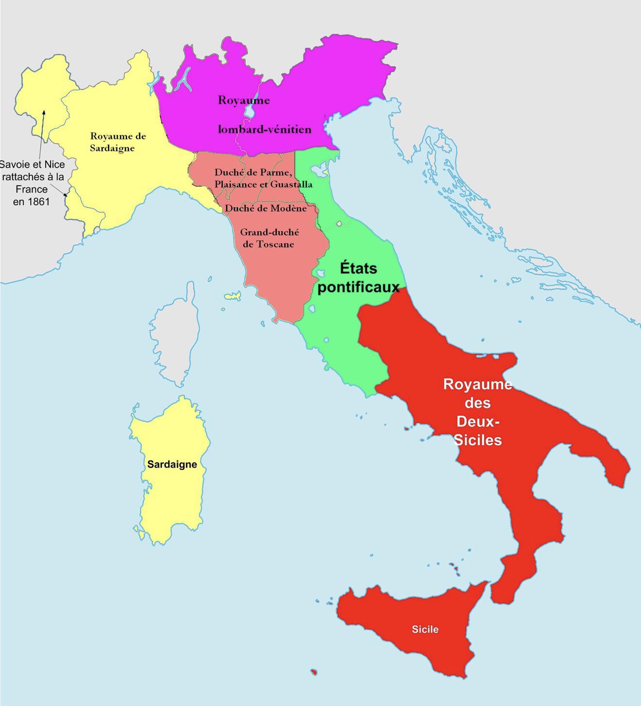À la veille de l’élection de Pie IX, l’Italie est un espace politique divisé en plusieurs États. Parmi eux, les États pontificaux occupent une place unique. Dirigés par le pape en tant que chef d’État, ces territoires couvrent une bande centrale du territoire italien, reliant la mer Adriatique à la mer Tyrrhénienne. Ils séparent physiquement le nord de la péninsule – dominé par le royaume de Piémont-Sardaigne et les possessions autrichiennes – du sud napolitain. Toute tentative d’unification passe donc par la dissolution ou l’intégration des États pontificaux au projet national, deux options auxquelles le Saint-Siège se refuse catégoriquement.