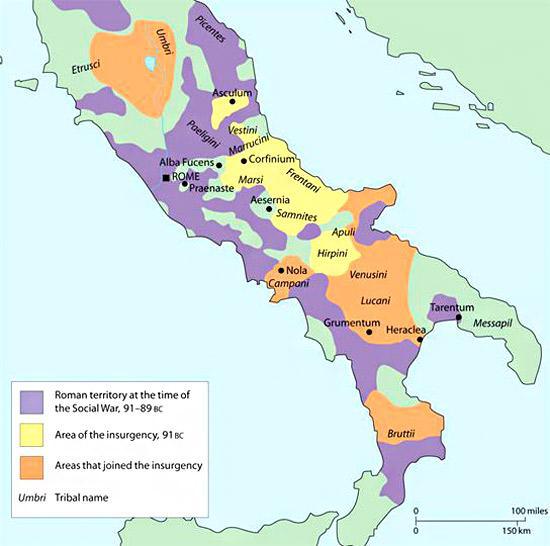 À la veille de la guerre sociale, l’Italie ne forme pas un ensemble cohérent, mais plutôt une mosaîque de cités liés à Rome de différente manière (municipes ; colonies romaines ; alliés...)