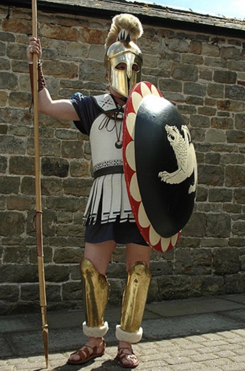 Reconstitution de l'uniforme d'un hoplite romain. Seuls les plus fortunés pouvaient se payer autant de matériel.