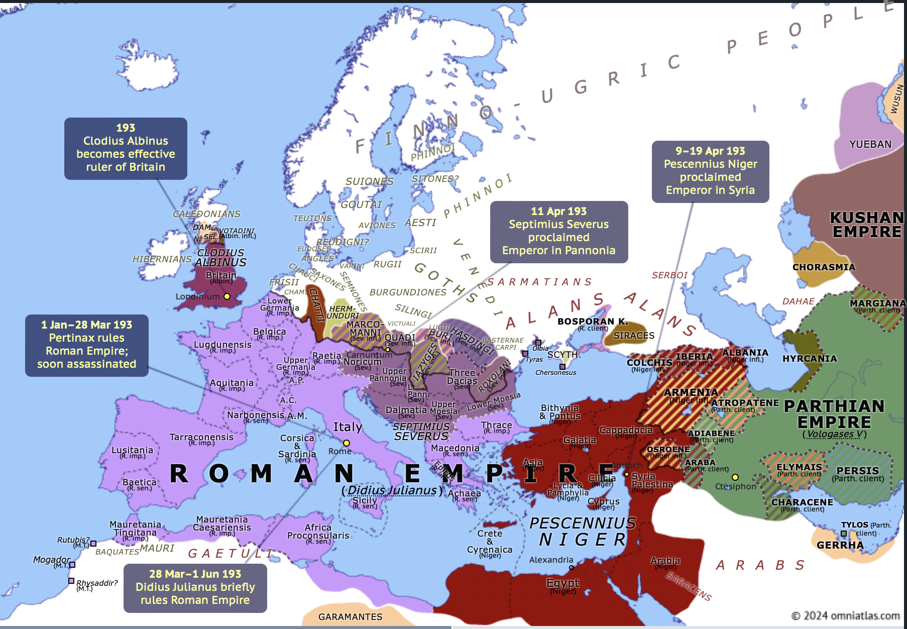 • Septime Sévère : En Pannonie, les légions acclament Septime Sévère, un général expérimenté. Il se révèle rapidement comme le prétendant le plus redoutable grâce à la puissance militaire qu'il contrôle. Sévère décide d'agir vite : il marche sur Rome pour éliminer Julianus, qu'il fait exécuter en juin 193.