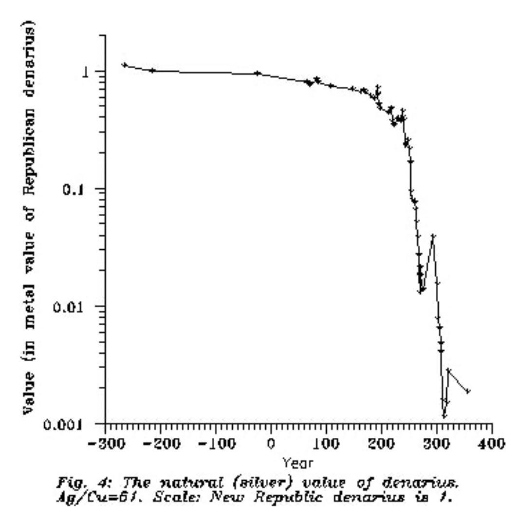 Graphique : la teneur en argent du denier Impérial, qui chute pendant le IIIème siècle (200-300)