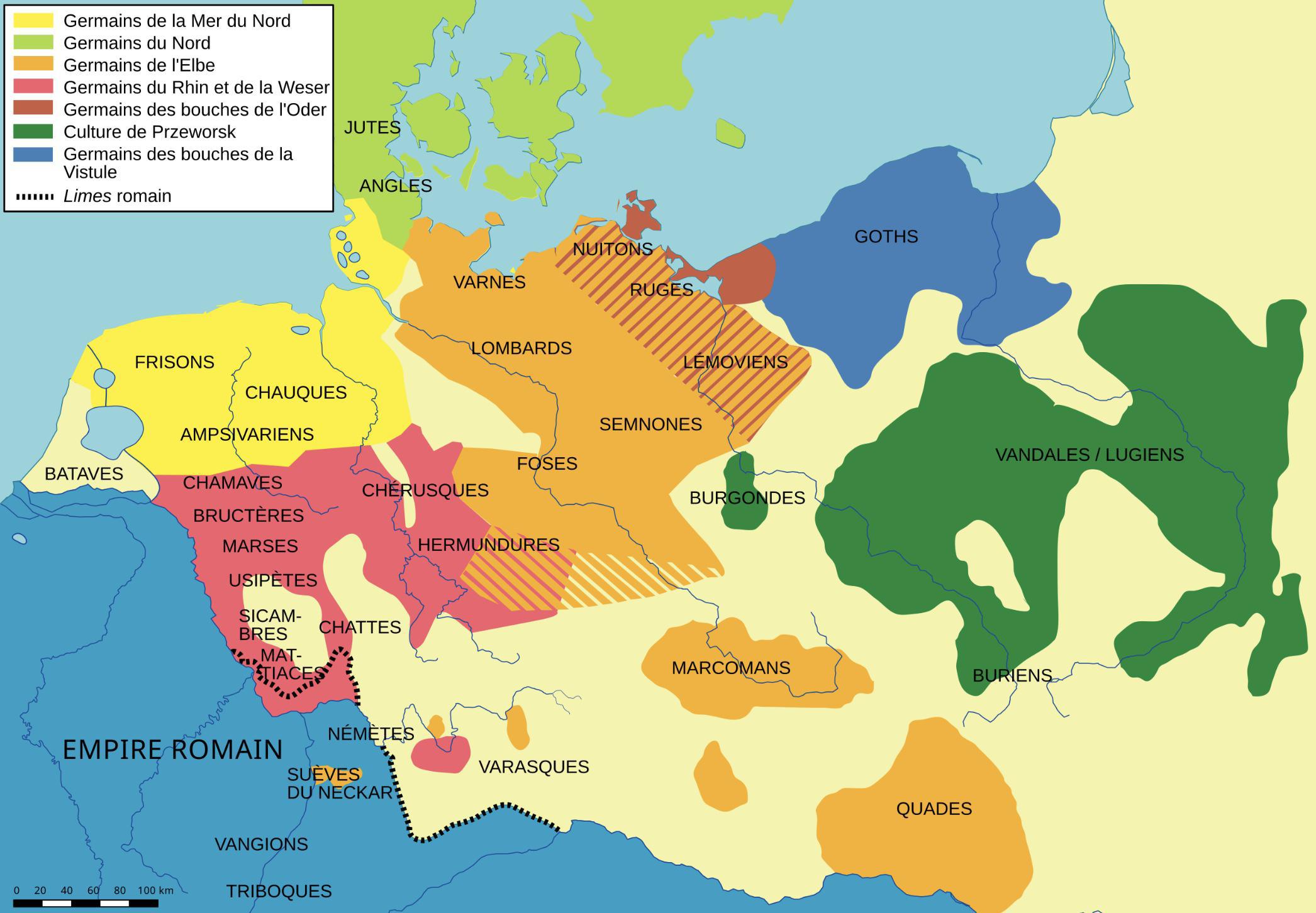 Carte : répartition des tribus germaniques au Ier siècle